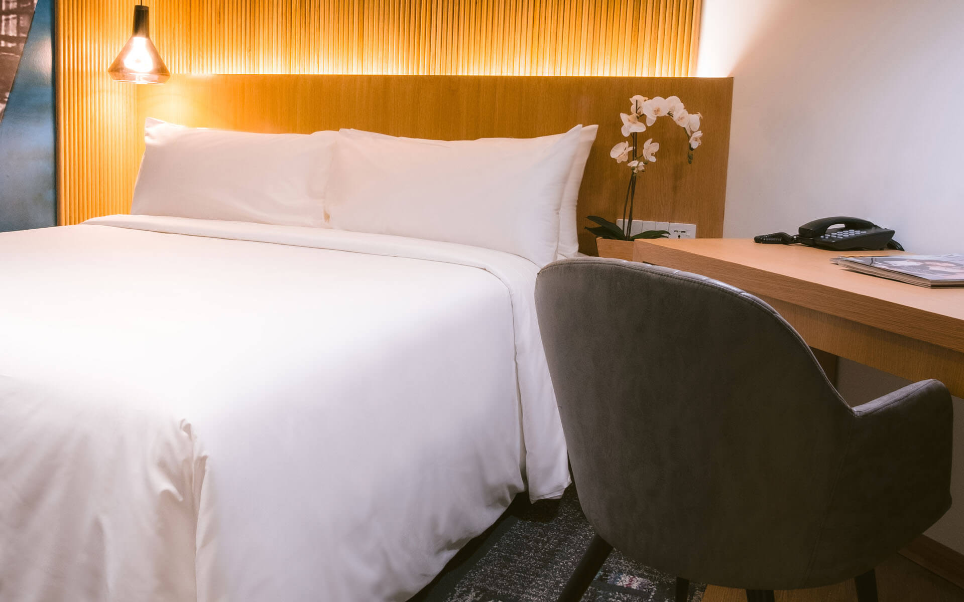 Featuring one Queen Bed with window. Rooms offer wireless internet access, minibar, coffee & tea making facilities, iron with board, hair dryer, 40-inch LED flat screen TV with premium channels, glass enclosed standing shower, in-room safe, large work desk with ergonomic chair and luxurious pillow top beds.